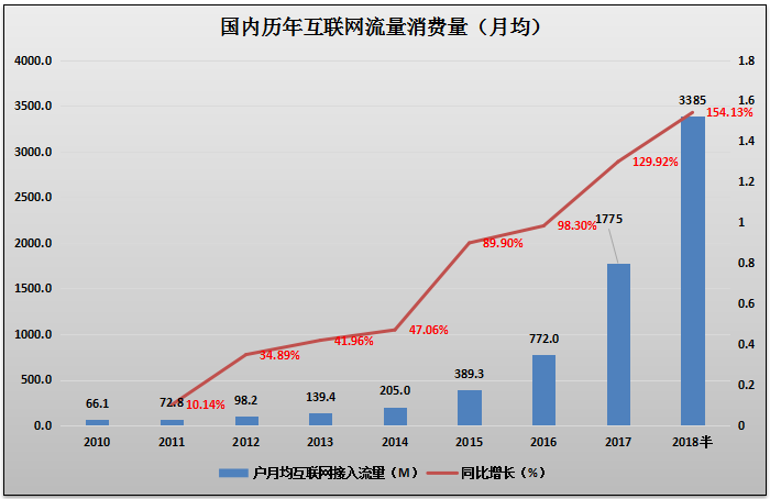 户月均互联网介入流量从2010年的66M/月,增长到2018年上半年的3385M/月,年复合增长率60%以上,同时18年上半年增速再创新高。5G作为新一代的通信技术,能够满足日益多样化以及极致性能的通信需求。