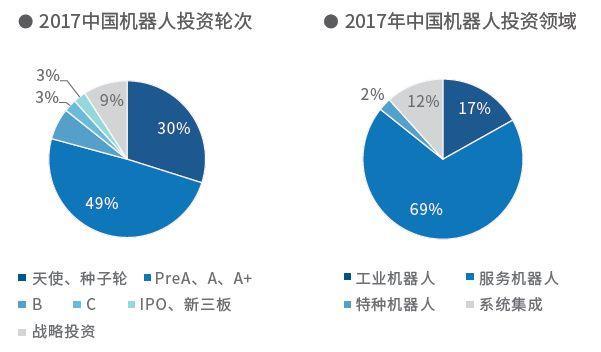 据公开数据整理,2017年,国内机器人相关项目投资热度高,项目数量约80个,总金额近60亿元;其中,项目投资阶段以VC为主,服务机器人成为投资热点,占比69%;物流机器人、教育机器人、医疗机器人成为资本关注重点;单项融资规模以千万级为主。