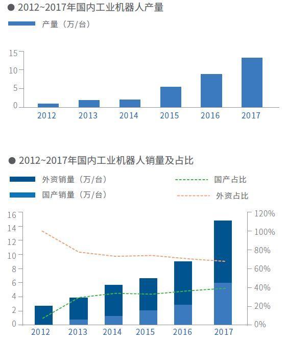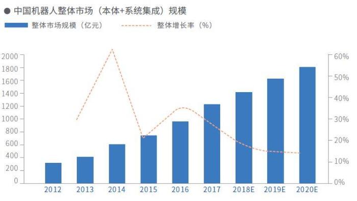 2017年,中国机器人整体市场进一步扩大,机器人本体与系统集成规模超1200亿元人民币,同比增长25.4%。