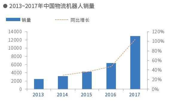 随着电子商务快速发展与物流自动化水平不足的矛盾激化,2017年,物流机器人销量持续增长,达1.29万台,同比增长103%;京东、阿里、苏宁等电商巨头加快推进物流机器人的常态化运营,申通、圆通等物流巨头加大无人仓布局;快仓、斯坦德机器人、爱啃萝卜机器人、艾吉威等创业公司获得资本青睐,已公开融资规模近10亿元。