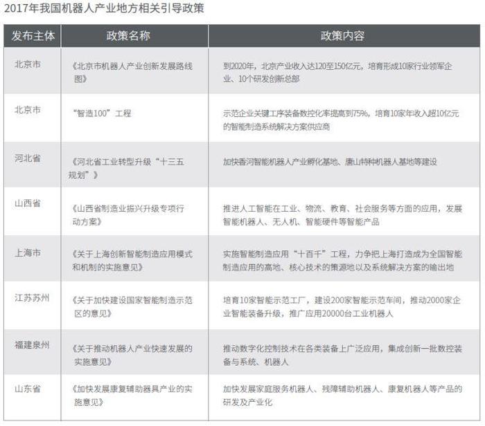 在国家政策对机器人发展大力助推的背景下,各省市纷纷发布相关机器人扶持、引导政策:地方政府聚焦自身优势产业,明确重点产业发展方向及产业规模,重点培育机器人产业集群,如河北省加快建设唐山特种机器人基地,河南省关注自动化物流设备;同时,偏重机器人应用补贴,如安徽等地依据不同标准向机器人购置企业进行财政补贴。