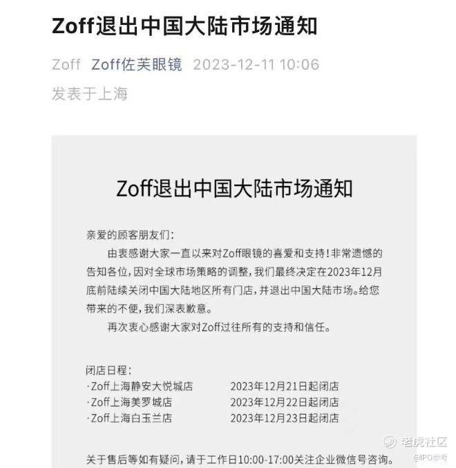 【Zoff退出中国大陆市场】12月11日,Zoff(佐芙)眼镜发布官方通知,因对全球市场策略的调整,我们最终决定在2023年12月底前陆续关闭中国大陆地区所有门店,并退出中国大陆市场。( Zoff佐芙眼镜)