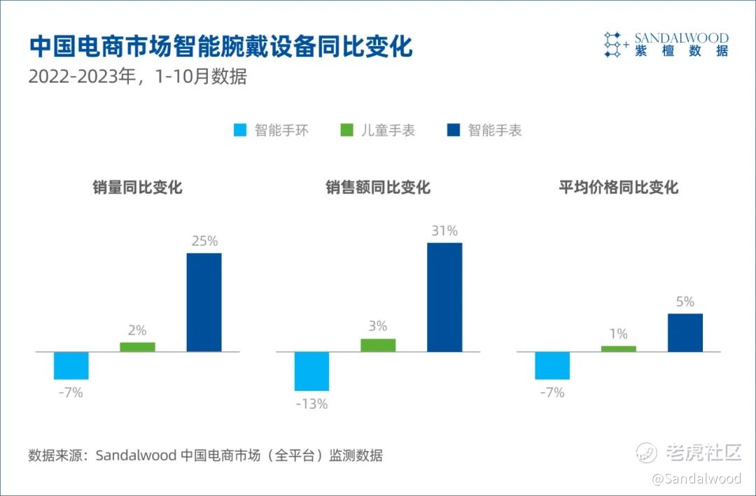 智能手表2023年1-10月销量和销售额的增长率分别高达25%和31%,平均售价也有5%的上升。