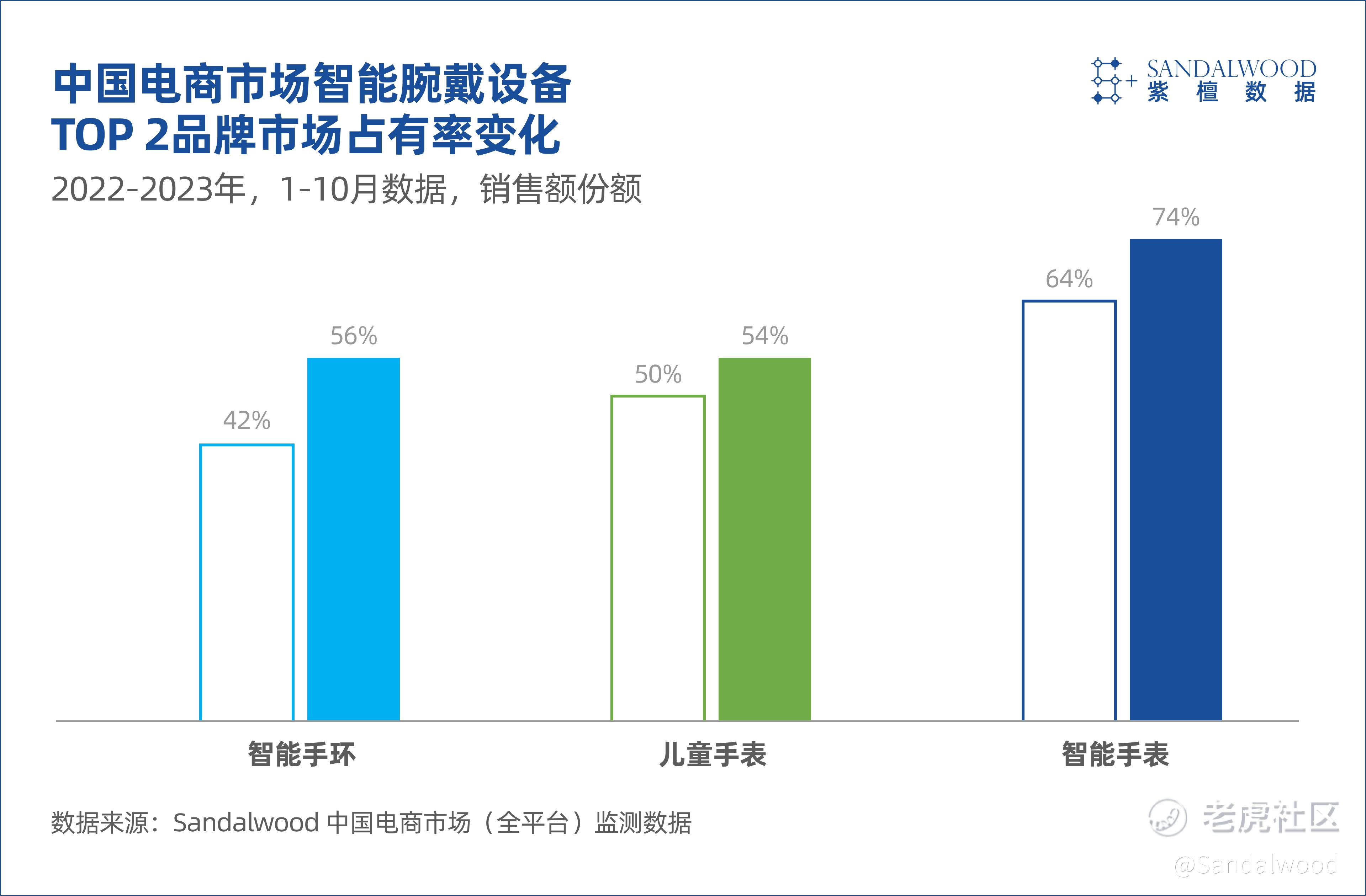 2023年1-10月,中国电商市场智能手环 TOP 2品牌销售额市场占比从42%增长至56%,以14个百分点的增长率,进一步收割市场空间。
