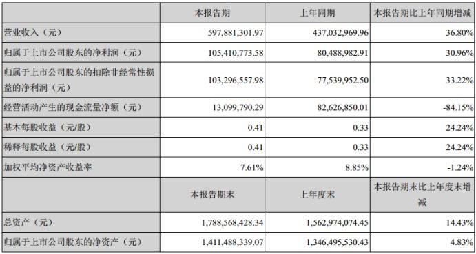 8月20日,洁美科技发布中期业绩报告,公司实现营业总收入5.97亿元,同比增长36.8%;归属于上市公司股东的净利润1.05亿元,同比增长30.96%。中报业绩亮点如下:
