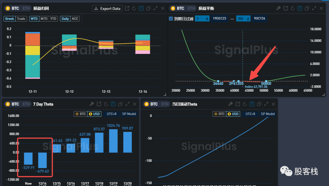 左下可以看到的theta目前是一个非常保守的状态,而右上角的盈亏曲线可有看到,我的账户尽量保持在中间左右移动的时候基本不亏钱,那么靠什么赚钱呢?当然是远端的vega。具体关于波动率接下来的操作,要等今天市场亚盘陆续消化完消息后我们再判断。