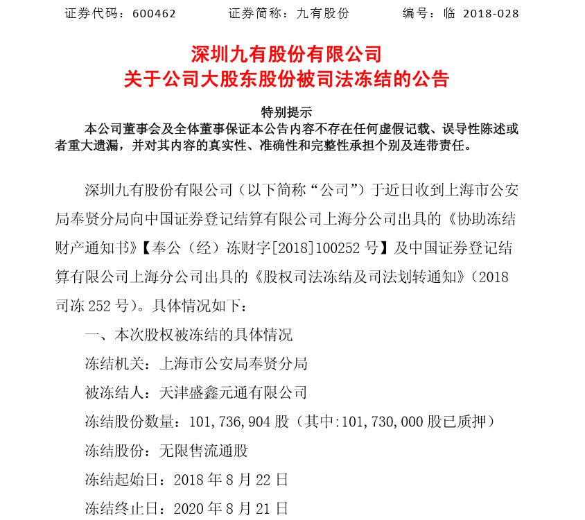 8月28日同时披露的还有一份九有股份大股东股份被司法冻结的公告。公告显示,大股东天津盛鑫元通有限公司持有公司1.02亿股,占总股本的19.06%,其中99.99%股份被质押,此次全部股份被冻结。