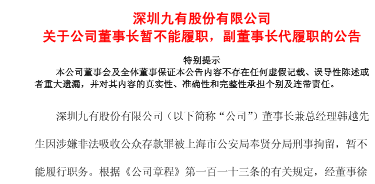 8月28日,上市公司深圳九有股份($(600462)$)发布公告,称董事长兼总经理韩越因涉嫌非法吸收公众存款罪被上海市公安局奉贤分局刑事拘留。因暂不能履行职务,由副董事长徐莹泱代理行使董事长职责。