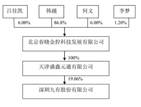 天津盛鑫是九有股份的第一大股东。天眼查显示,天津盛鑫由北京春晓金控科技发展有限公司100%控股,韩越是其执行董事,同时韩越也是春晓金控的实际控制人,持股86.8%。