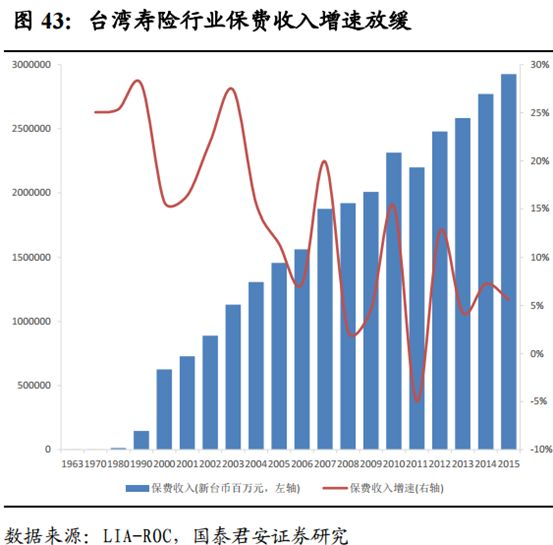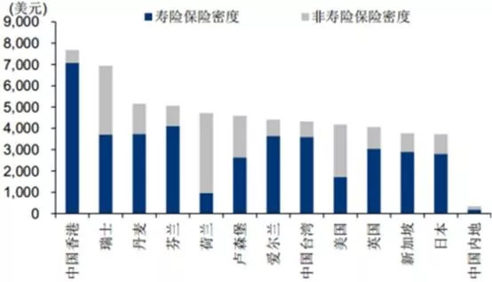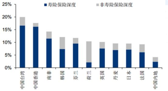 台湾其实是最具可比性的地区,因为都是中国人,文化教育习性都差不多。台湾保险市场比我国成熟,深度密度都达到较高水平,这是由于过去几十年台湾保险发展也是比较好的。