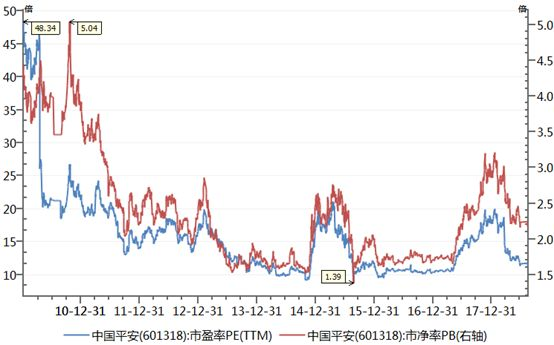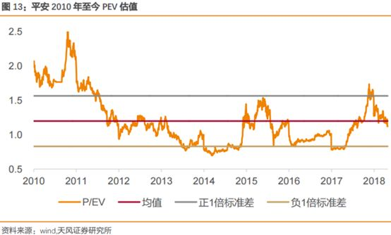 PEV估值近几年大多数时候处在1-1.5倍PEV,同国际对比的角度去看,是属于低估的。其中,平安曾在13、14、17年多次跌破1倍PEV,都是属于市场基于极度悲观预期的表现(相当于市场认为平安的未来就像现在日本保险市场的未来一样暗淡)。