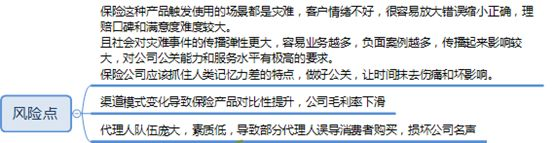 风险点我们目前总结的是下图的这三点,但不是说只有这三点,只不过这是我们认为这是保险企业特有的几点风险,且影响是长期的而不仅仅引起短期利润波动这么简单。