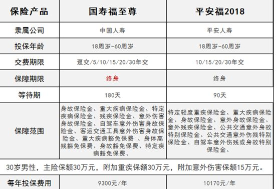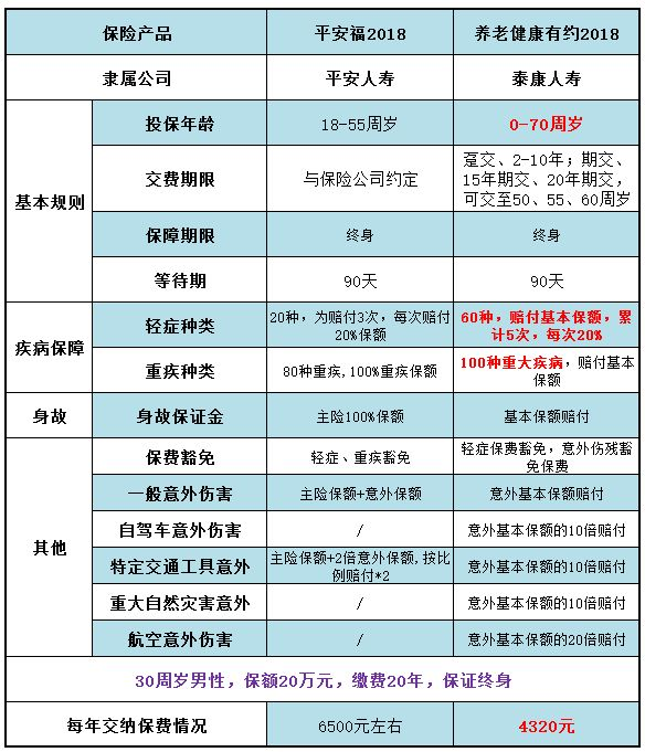 看不出上表各产品的区别不要紧,我们直接拿今年平安福与寿险中两大代表对比——国寿(国企龙头代表)、泰康(民企龙头代表)。