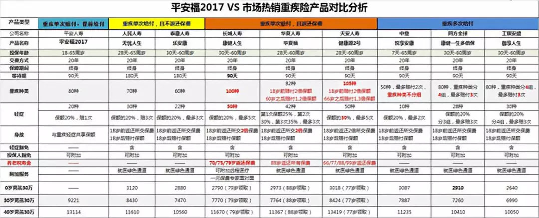 下面这个表就是平安福2017与市面上其他热销的重疾险产品的对比,可能大部分人看完之后会说根本不知道怎么比,也不知道差距多大。