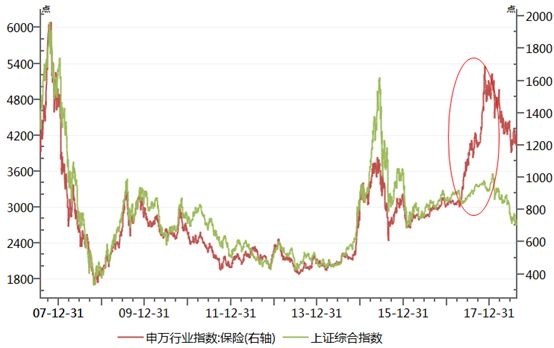 影响保险股估值的两大因素分别是大盘以及十年期国债收益率。首先肯定是受到大盘的影响是最大的,不过这里就不展开了,直接讨论十年期国债收益率。
