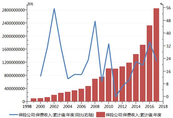 我国保险市场相比前面提到的几个市场来说,尚处于快速成长期,从近三十年的保费收入可以看到,我国保费收入大多数年份都是保持着两位数的增长,增速明显优于上述的那些国家。