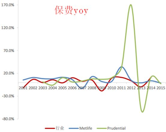 美国市场我们找到的是MetLife和Prudential这两家龙头,通过国泰统计的图表可以看到,这两家企业大多数时候表现是优于行业平均的,但增速都不高,大多数时候都低于20%。