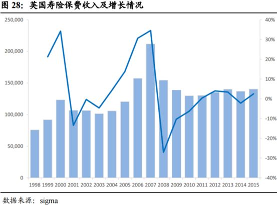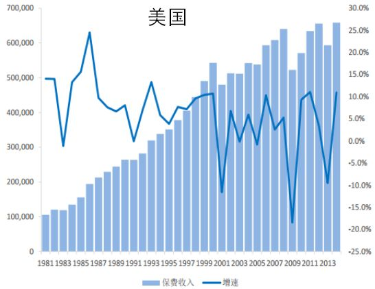 但进入到21世纪后增速发生了明显的降档,经济不好的几个年份也出现了负增长,标志着美国保险市场也处在成熟期了。