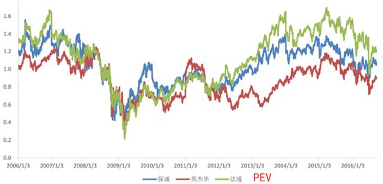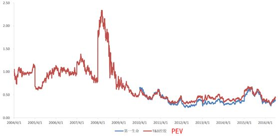 其中,两大龙头第一生命以及T&D都呈现出类似的业绩走势,在2011年出现了回暖。相应的,PEV估值也差不多在11年出现见底,开始回升(2010年以来,估值水平在0.25倍-0.7倍PEV之间)。