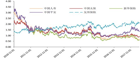 实际情况来看,我国四大保险公司近几年的PEV估值区间大致在1-2倍之间波动(友邦不算在内),并没体现出我国保险市场未来的前景。