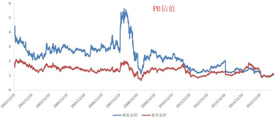 这里选取了台湾两大龙头国泰金控与富邦金控作为参考,由于这两家公司没披露内含价值,于是我参考了PB估值。