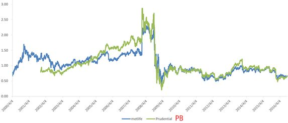 可以看到,这两家台湾保险企业在进入21世纪之后都出现了一次估值下降,之后又在08年金融危机之后继续走弱。国泰金控的PB估值平台从4倍降到2-3倍,再降到1-2倍。