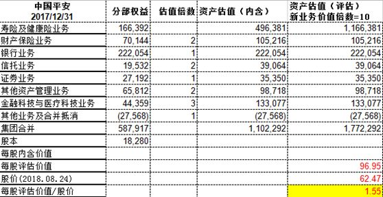 因此对平安寿险业务的绝对估值,大致逻辑也是如此。我在此估值逻辑背景下,对平安进行了估值,具体情况如下表(虽比较粗糙,但大致估值就可看出平安当前的低估)。