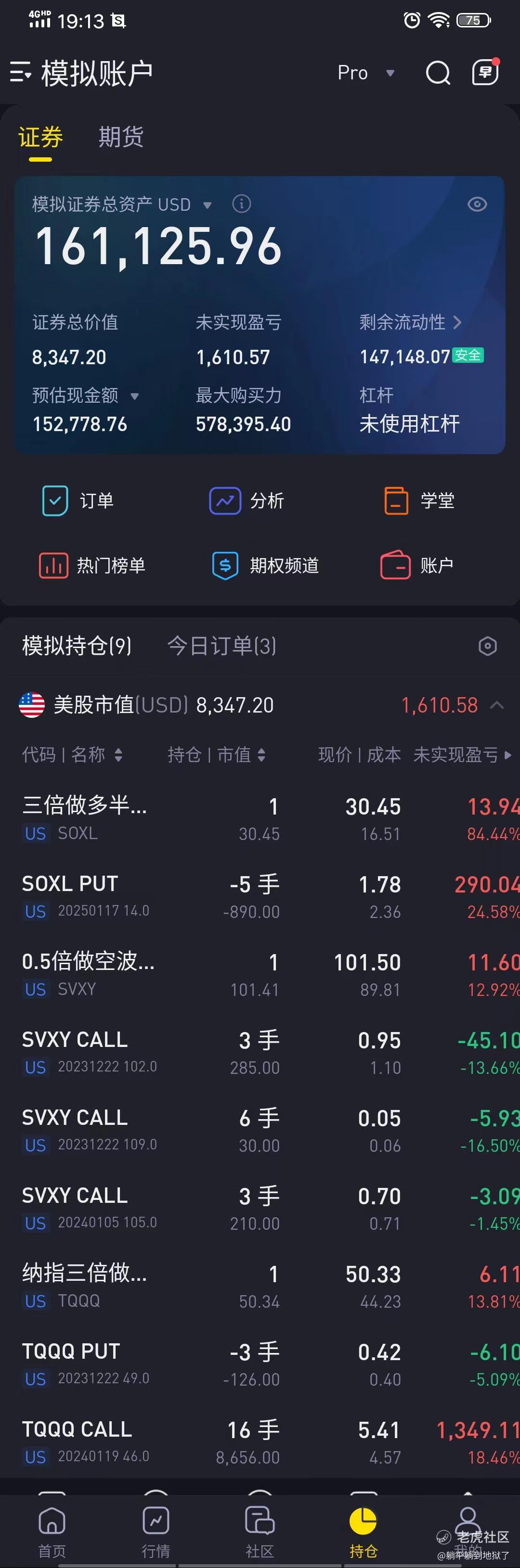 【10万美刀模拟盘】(主要操作TQQQ、SOXL、SVXY正股和期权)。仓位:0.5成。昨日操作:小幅减仓TQQQ-CALL。今日计划:逢高做T,以持仓待涨为主。见附表(持有CALL多次大幅回辙教训:收盘破5日均清仓CALL,正股减仓或上保护;收盘破20日均线,全部清仓。附:《模拟盘持仓收益图)
