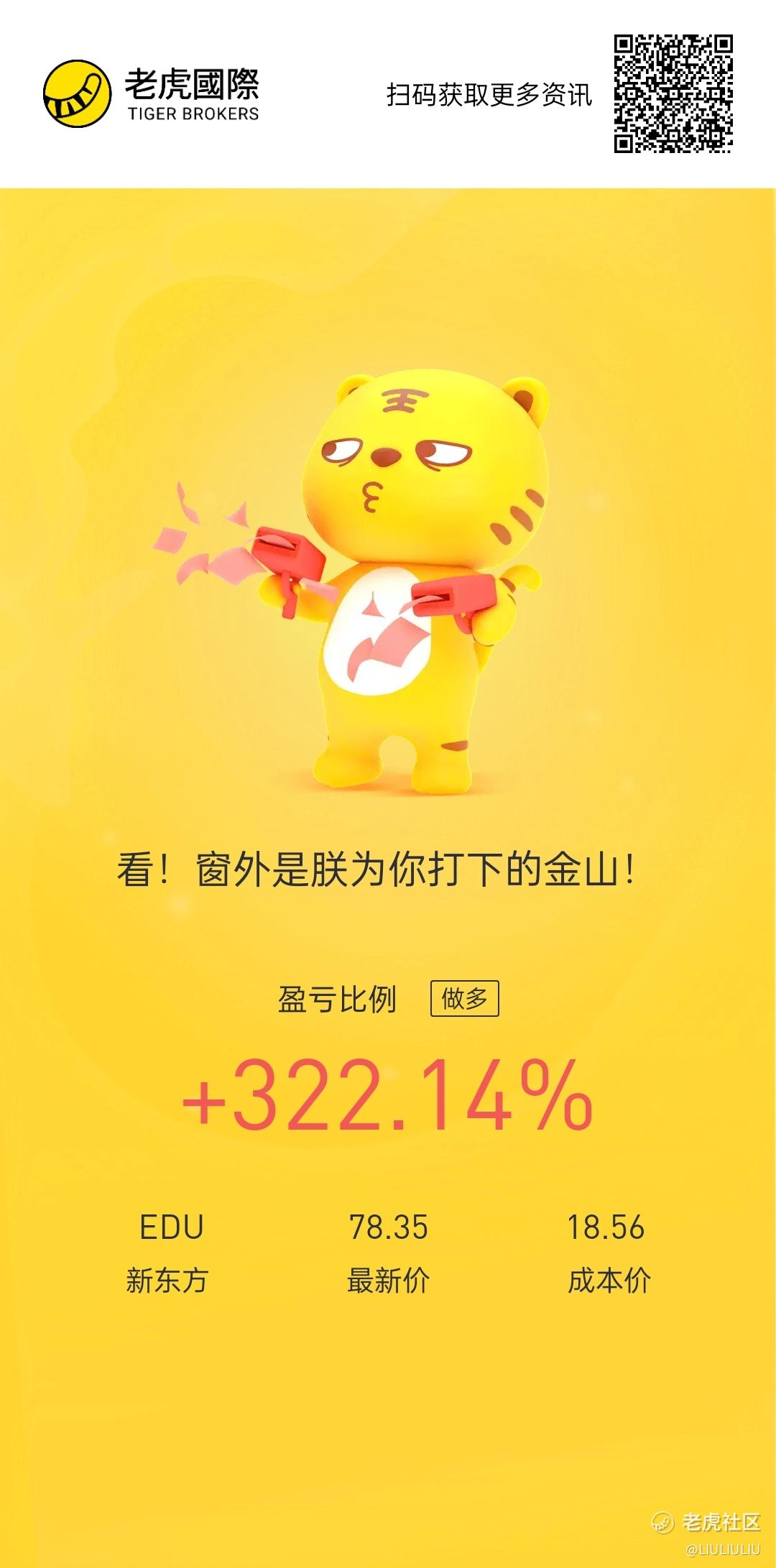 今天与我们分享的虎友是 @LIULIULIU ,在董宇辉全网爆火时,他抓住了新东方的机会,果断上车,获得了322%的收益[财迷][财迷]