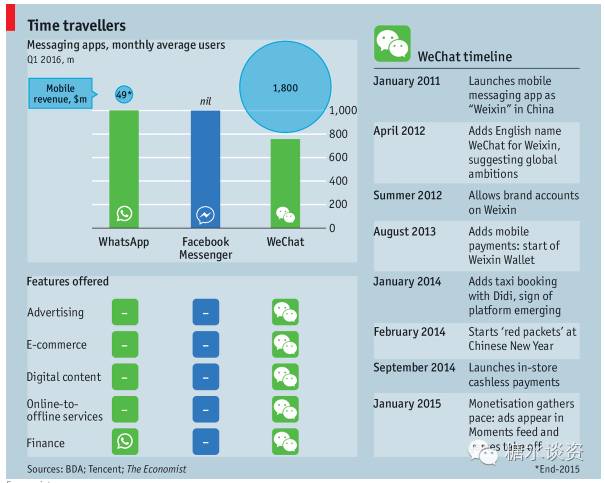 另外,经济学人也给出了一个微信与FB的Messenger和WhatsApp的比较,主要是为了突出微信的货币化进度比FB系更快且更多元化。