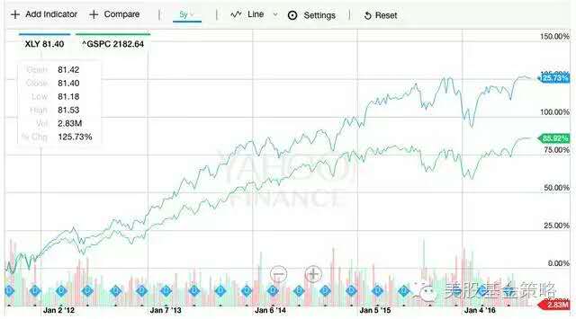 可以看到,蓝色的XLY在近5年的累积收益上,高达125%,远超标普500指数的85.92%。
