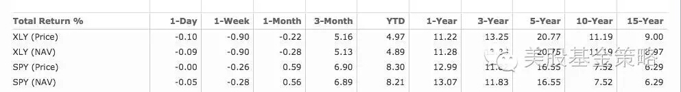 可以看到,XLY在3年、5年、10年、15年的年化收益率上均高于SPY,以10年来看,每年年化收益高出3个点以上,已经是非常大的差距。
