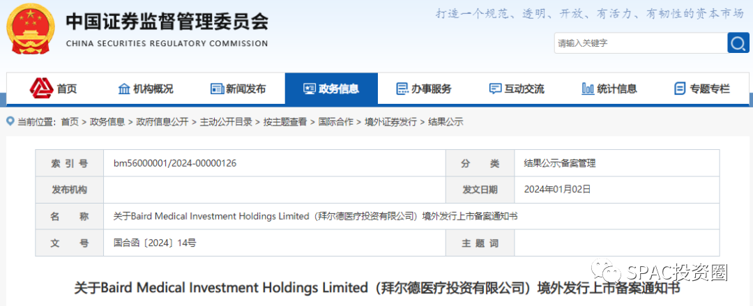 1月2日,中国证监会国际合作部发布关于Baird Medical Investment Holdings Limited(拜尔德医疗投资有限公司)境外发行上市备案通知书(国合函〔2024〕14号)。