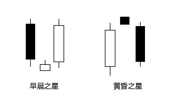 一根实体较长的阴线之后紧接着出现一根跳低开盘的小阳线,第三天又出现一根阳线,且收盘价切入第一根阴线的上半部分。这种组合若出现在股价运行的底位,则是见底反转的信号。黄昏之星情况完全相反。