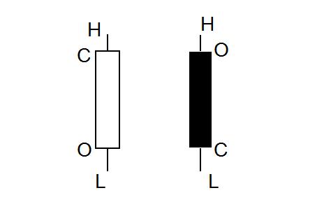 上图中,中间的矩形长条叫实体,上、下伸出的两条细线叫上、下影线。如果开盘价高于收盘价,则实体为阴线或黑线(如右);反之,收盘价高于开盘价,则实体为阳线或红线。将四个价格在坐标纸上一一标出,然后按上图的方式即可画出。将每个交易日的K线连接在一起,就构成反映股票价格历史情况的K线图。