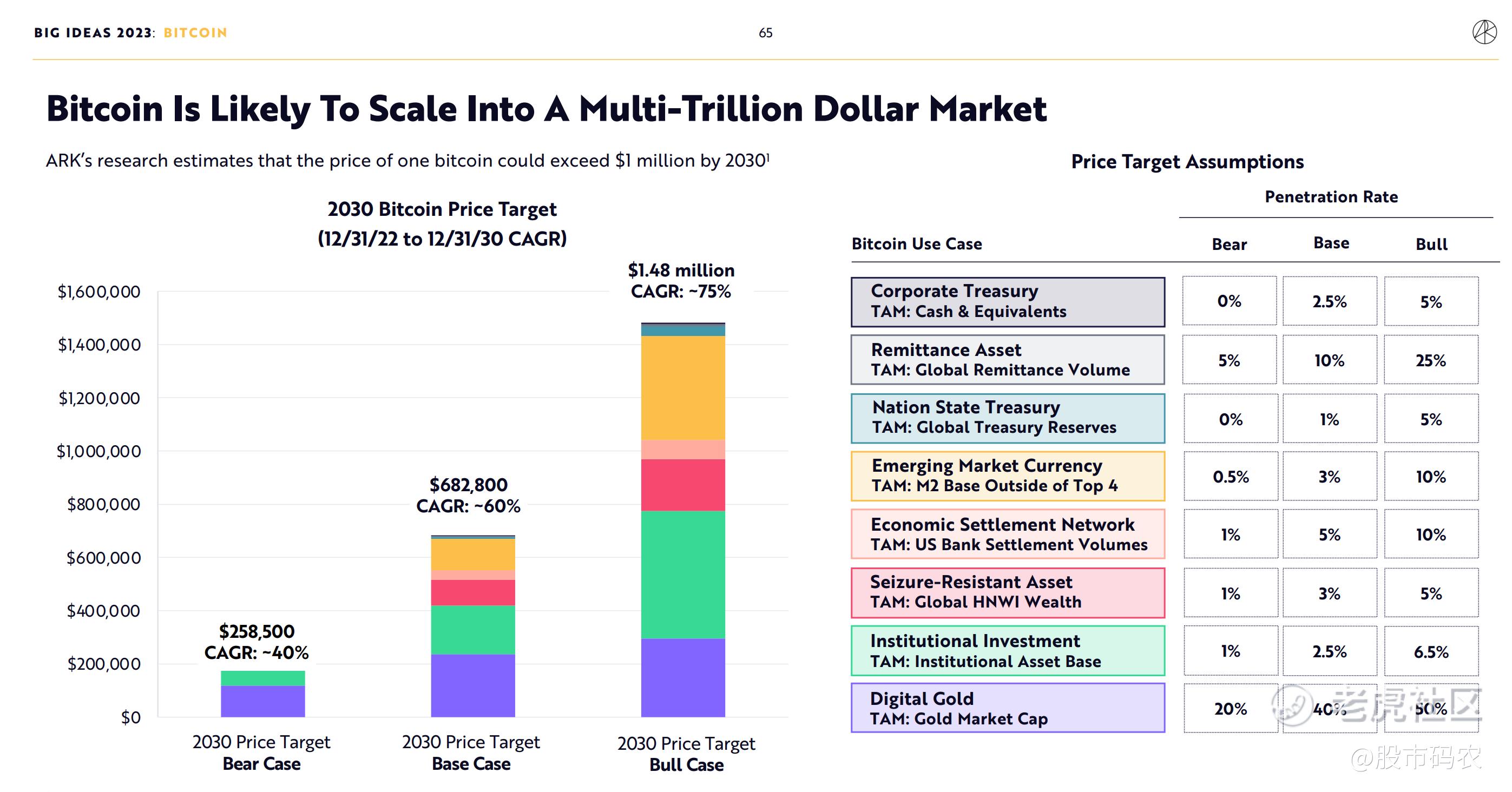 今年有两个比特币相关的大事件,一个就是最近SEC可能会批准现货ETF,会带来一些增量资金,再一个就是4月底的减半行情,参考2020年的减半也会有很大的涨幅,参考2023年ark基金木头姐的预估,到2030年,比特币可能会涨到100w美元。比特币价格预估最难的就是它不像苹果或者茅台这样可以有利润作为支撑来预估,比特币的价值得依靠共识和信仰,我个人的预估是今年超过6.8w的历史最高点是大概率事件,至于超过后最高能到多少我也不关心。