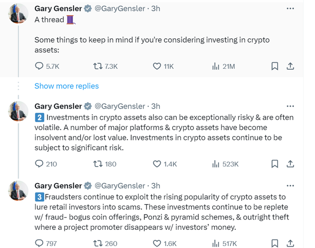 SEC现任主席Gensler周一在X平台(前推特)上发表了推文,提醒投资者加密货币相关的诸多风险,被认为是比特币现货ETF获批临近。