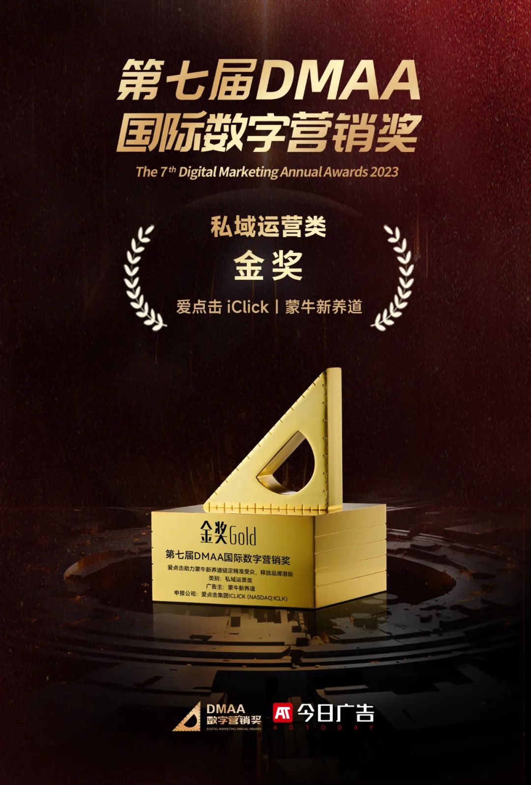 第七届DMAA国际数字营销奖颁奖典礼于近日在广州落幕。DMAA由中国数字营销门户今日广告主办,旨在打造数字营销行业标杆,推动行业创新。爱点击助力蒙牛新养道私域营销案例凭借专业的组合策略、精细化运营能力,以及超预期的交付成绩,一举摘得DMAA国际数字营销奖案例金奖。