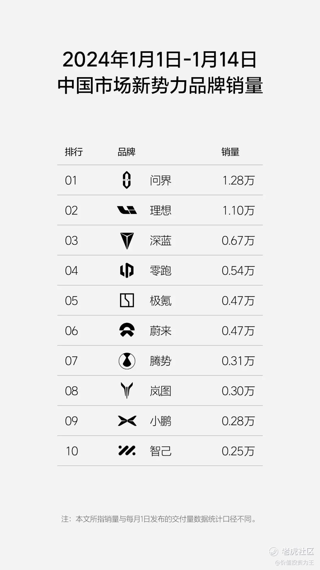比如说,在今年1月1日-14日新势力汽车品牌中,问界突然取代理想,荣盛销量第一!