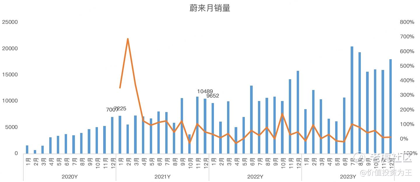 比如2021年1月,蔚来销量为7225辆,高于2020年12月的7007辆;2022年1月销量9652辆,环比2021年12月的10489辆轻微下滑。2023年1月受疫情肆虐影响,可比意义不大: