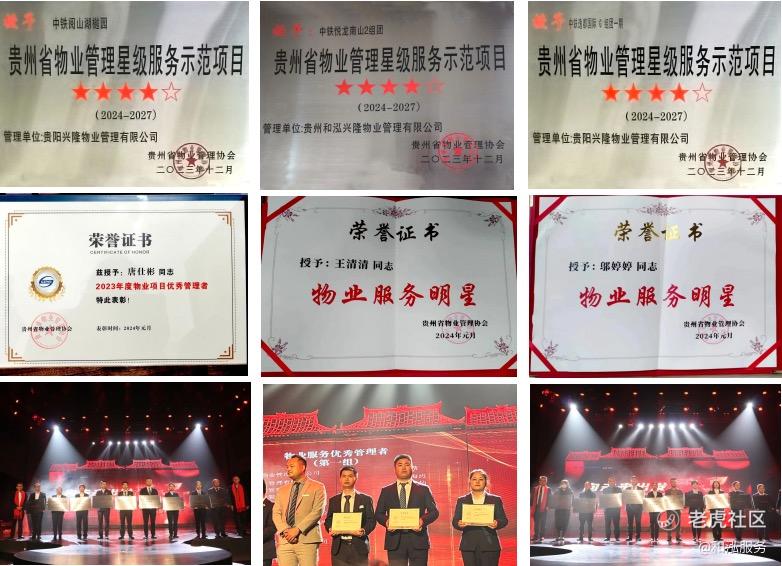 表彰大会上,和泓服务贵州区域公司在管项目中铁阅山湖樾园、悦龙南山、中铁逸都国际 G 组团一期等项目凭借出色的综合实力,荣膺“贵州省物业管理星级服务示范项目”奖项,悦龙南山项目经理唐仕彬凭借卓越的管理才能荣获“物业项目优秀管理者”奖项;优秀员工邬婷婷、王清清荣获“物业服务明星”荣誉称号。