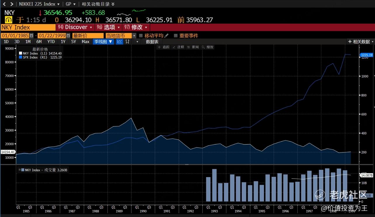 下图是日经225指数和纳斯达克 $纳斯达克(.IXIC)$ 、标普500指数 $标普500(.SPX)$ 在1985-1999年的走势: