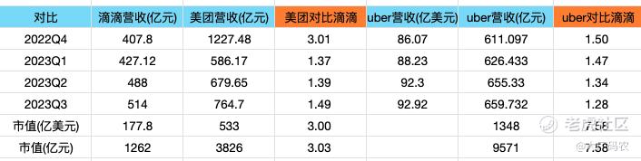 我们看上面表格,先拿滴滴和同是做网约车的uber来对比一下,uber营收对比滴滴每个季度在1.3 ~ 1.5倍之间,但是市值却是滴滴的7.5倍,从营收和市值来看,如果uber当前估值是合理的,那滴滴就是被严重低估了。