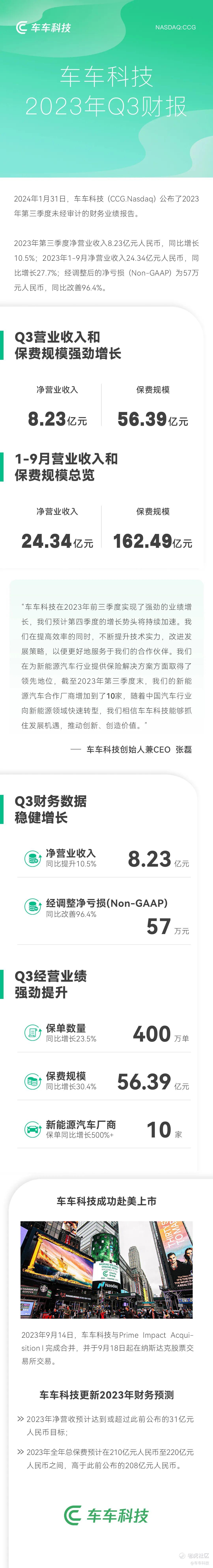 2024年1月31日,车车科技(CCG.Nasdaq)公布了2023年第三季度未经审计的财务业绩报告。