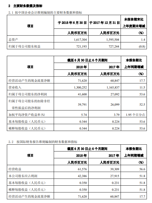 2018年中期业绩,营业收入13002亿,同比增长11.5%,创十年来第四高;股东应占利润为人民币424亿元,同比增长51.8%;每股派息0.16元,同比增长60%。