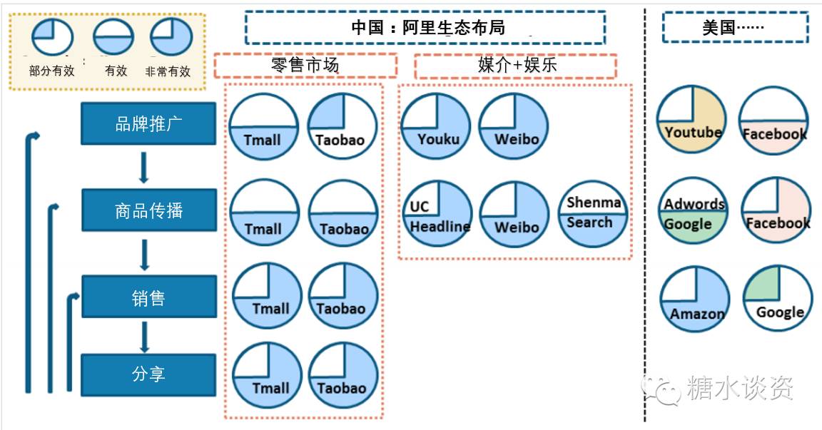 但实际上阿里巴巴在中国的生态和美国又是不一样的格局,阿里把几个主要的渠道都覆盖了,并不像美国市场,整个生态仍然被巨头们瓜分。
