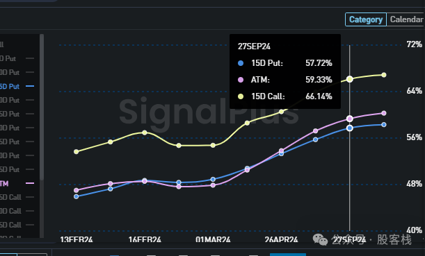 这几天远端一起空vega的朋友们肯定账户净值也对应的有回撤,现在期权市场上的乐观情绪比之前相比只强不弱,举个例子,我们看下图的call的IV曲面直接原地起飞,大饼的otm比ATM溢出了7个点左右