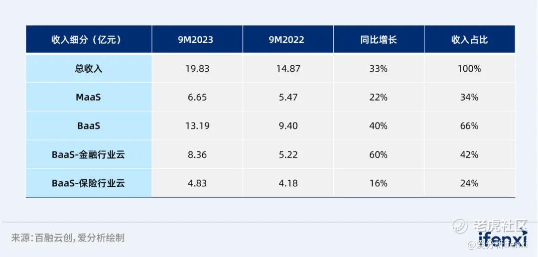 BaaS业务是百融云创的第二增长曲线业务,其重要性从其收入占比和增速就可以得到验证。2023年前9个月,BaaS业务收入占比为66%,收入增速达到了40%,尤其是其中的金融行业云业务收入更是增长了60%,显著拉高了BaaS业务收入增速。