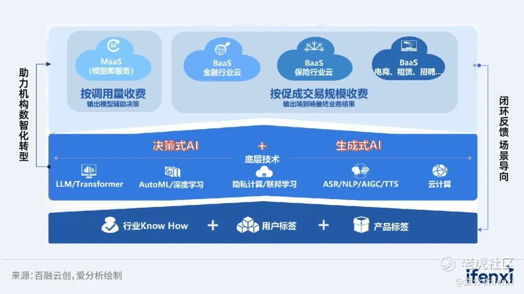 如上一篇内容所介绍,百融云创成立于2014年,于2021年3月正式在香港联交所挂牌上市。百融云创自身定位为一站式服务的AI科技领航者,其核心产品和技术都是基于AI。依托机器学习、NLP、智能语音、大模型等决策式AI和生成式AI底层技术方案,百融云创为企业客户提供MaaS(Model as a Service,模型即服务)和BaaS(Business as a Service,业务即服务)两种模式的服务,场景涵盖营销、用户运营、财富管理等,客群覆盖银行、消金、保险、电商、汽车、物流、票务、能源和建筑等多个行业。