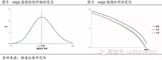 vega为期权价格对波动率的一阶导数,表示标的资产价格波动率发生1单位变化时,期权价格变化的单位数。vega的曲线形态和gamma类似,也是平值期权最大,深度虚值和深度虚值最小,且接近于0。理论上标的资产、行权价、到期日均相同的认购期权和认沽期权的vega是相同的,且均大于0。